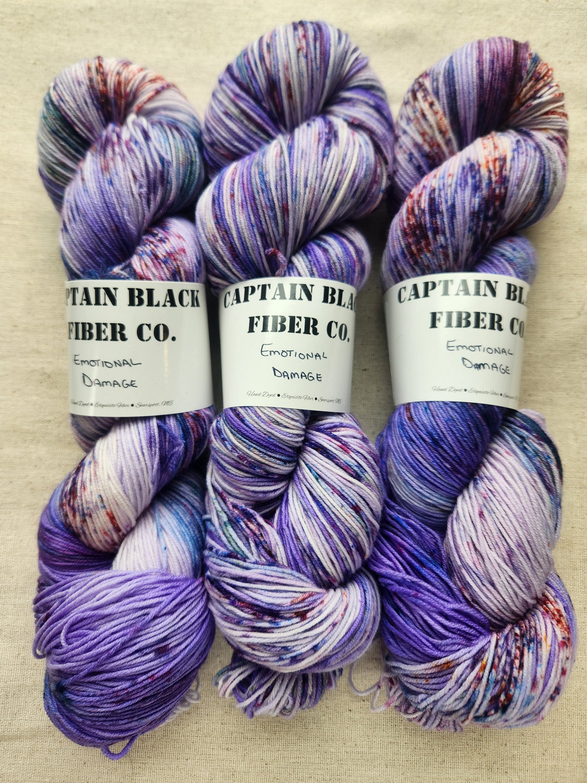 Emotional Damage is dyed in two light and lavender shades of purple, then sprinkled with wine and navy blue specks.